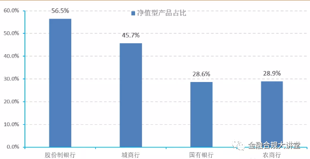 由圖可見(jiàn),雖然股份制銀行的凈值化產(chǎn)品比重相對(duì)較高,但也只是剛剛到50%以上,而其他類型銀行凈值化產(chǎn)品占比極其少。
