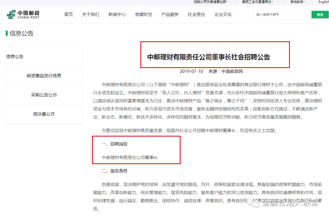 但是我們可以看到趨勢(shì)是在改變的,已有一些理財(cái)子開(kāi)始對(duì)人員進(jìn)行更新?lián)Q代,面向社會(huì)招聘新的團(tuán)隊(duì)人員。比如下圖,中郵理財(cái)社會(huì)招聘董事長(zhǎng)。