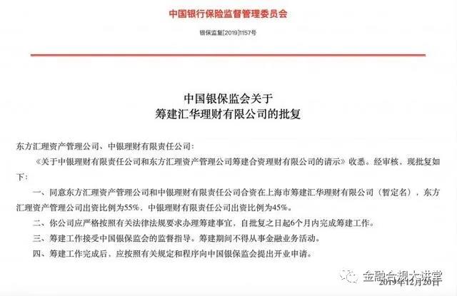 2019年12月20日中銀理財(cái)獲批與東方匯理資管合作,籌建匯華理財(cái)有限公司。這家中外合資理財(cái)公司稱為首家獲批籌建的有境外資管機(jī)構(gòu)控股的理財(cái)公司。